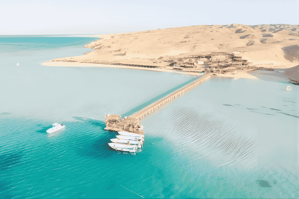Your day begins with hotel pickup and a comfortable transfer to the marina, where you’ll board a spacious boat and sail across the crystal-clear waters of the Red Sea. Along the way, you’ll stop at vibrant coral reefs for snorkeling, where you can explore colorful fish and stunning underwater landscapes.